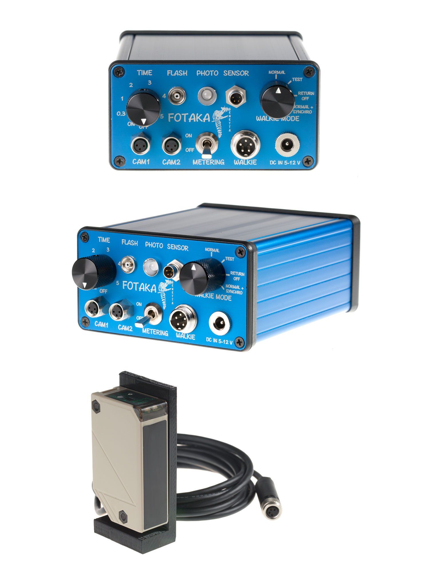 El sensor suminstrado es un sensor industrial, el Takex DLS-202. Incluye soporte con rosca de 1/4 de pulgada para su colocación sobre trípodes o pinzas fotográficas.