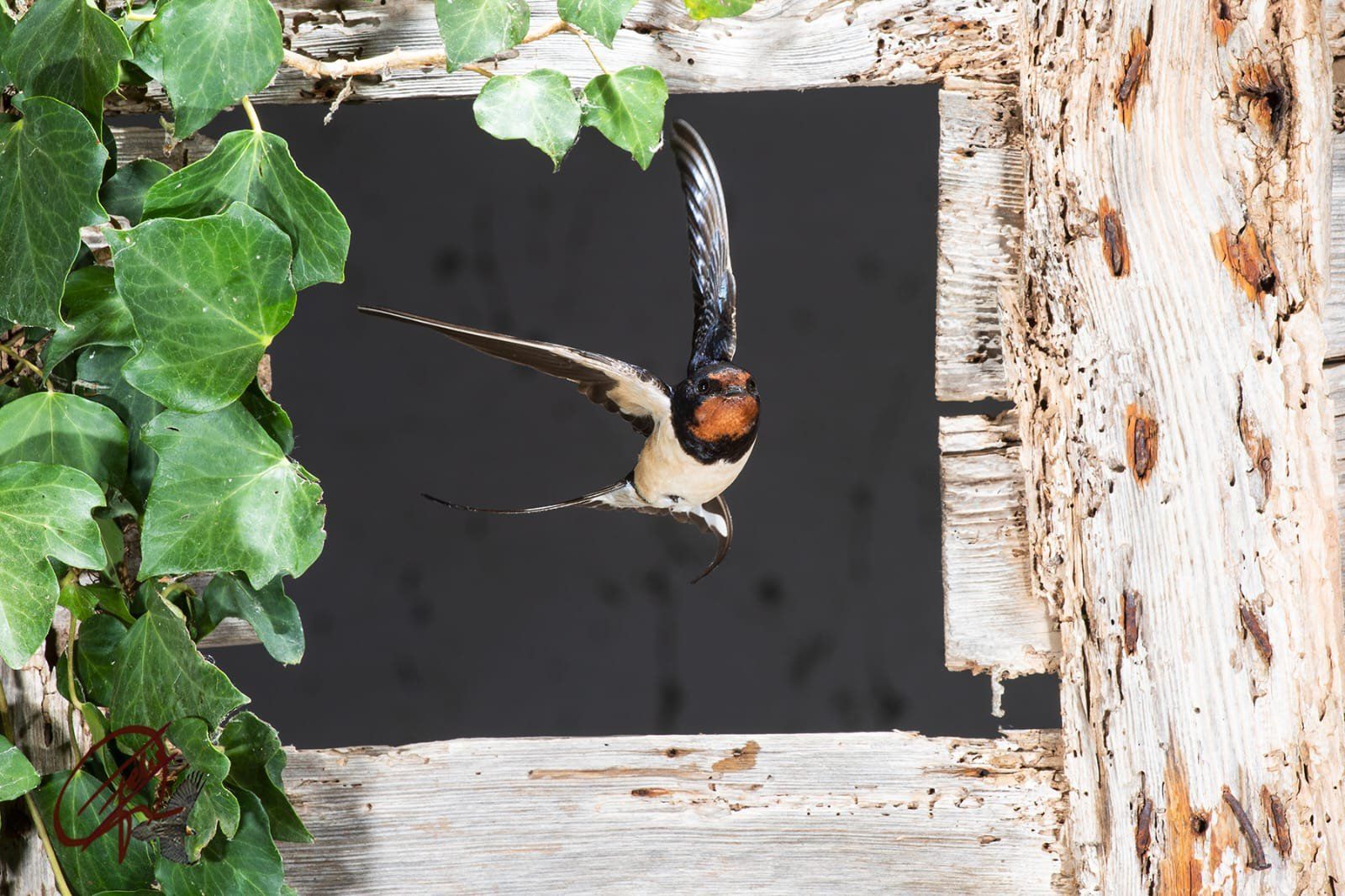 Comentario del Autor: "Intentando no dejar el fondo negro, para darle más naturalidad y dado que el habitáculo era bastante grande, se puso un flash a f8 y el resto, hasta un total de cuatro, aparte del mencionado, estaba a f16. Se intentaba iluminar mas una pared interior pero con eso , más la luz lateral de una ventana lo único conseguido fue provocar unos halos en algunas partes de la golondrina. Pero como de todo se aprende, se corrigió la diferencia de potencias para subsanar el error"